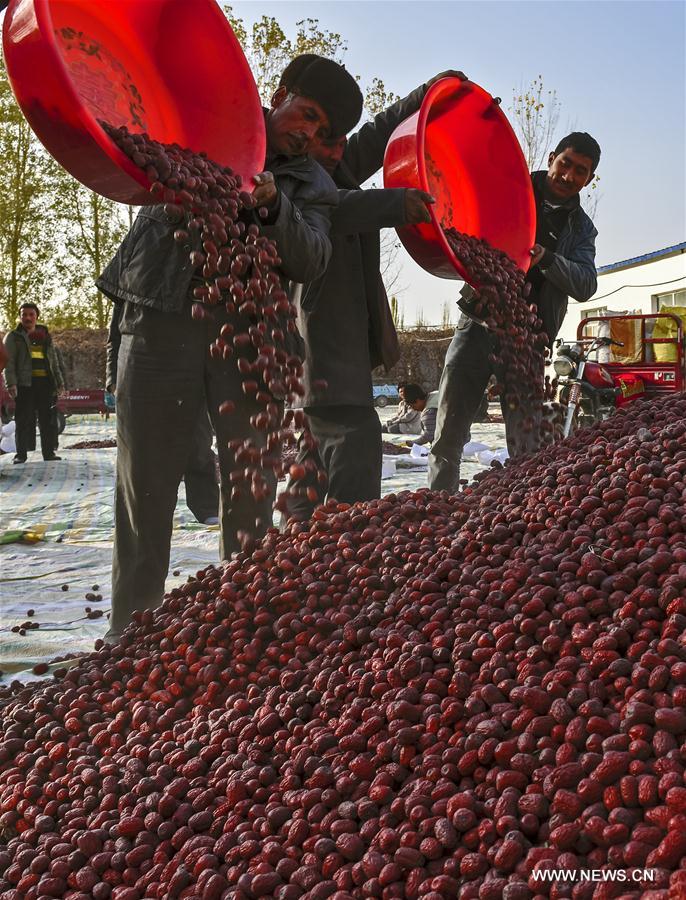 Villagers dry red dates in Yopurga County, northwest China's Xinjiang Uygur Autonomous Region, Nov. 9, 2016. The output of red dates in Yopurga County reached 80,000 tonnes this year. (Xinhua/Shen Qiao)