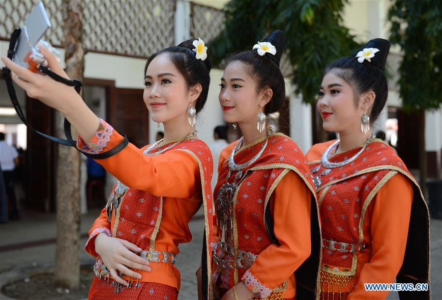 Students take a selfie during the celebration of the 79th founding anniversary of Lieutou Chinese School in Vientiane, capital of Laos, Nov. 11, 2016. The Lieutou Chinese School, founded in 1937 and financed by local Chinese, now hosts more than 2,800 students. It teaches both Chinese and Laotian and offers courses from kindergarten to high school. (Xinhua/Liu Ailun)