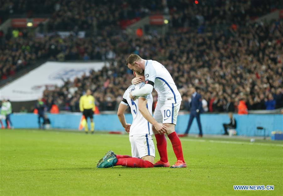 Wayne Rooney (R) of England celebrates Gary Cahill's goal during the Group F match between England and Scotland at 2018 FIFA World Cup European Qualifiers at Wembley Stadium in London, England on Nov. 11, 2016. England won 3-0. (Xinhua/Han Yan)