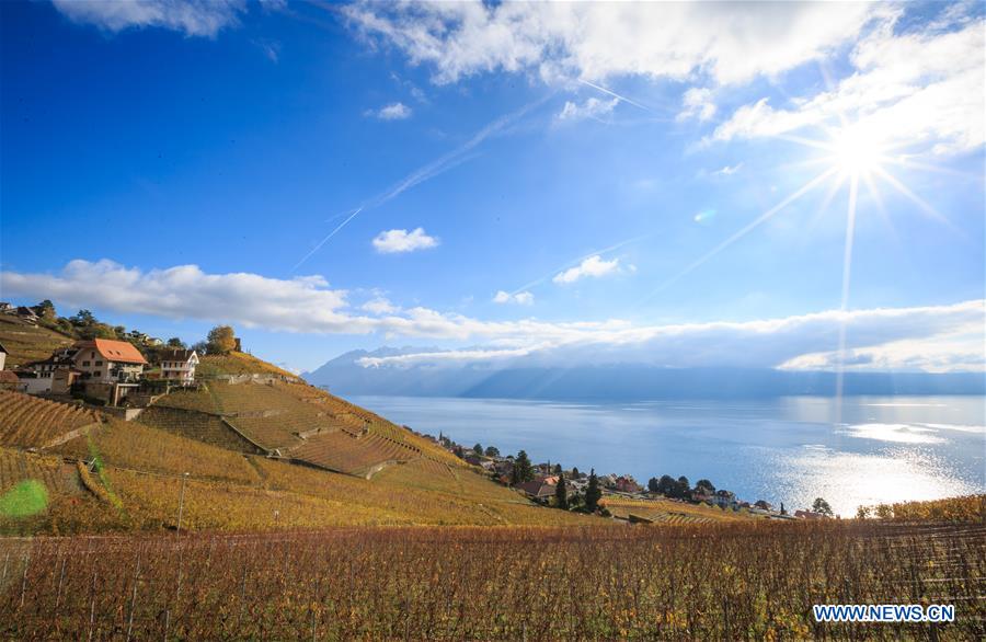 Photo taken on Nov. 12, 2016 shows the late autumn scene in vineyards in Lavaux, Switzerland. Lavaux Vineyard Terrace has been inscribed on the UNESCO's World Heritage List since June 28, 2007. (Xinhua/Xu Jinquan)