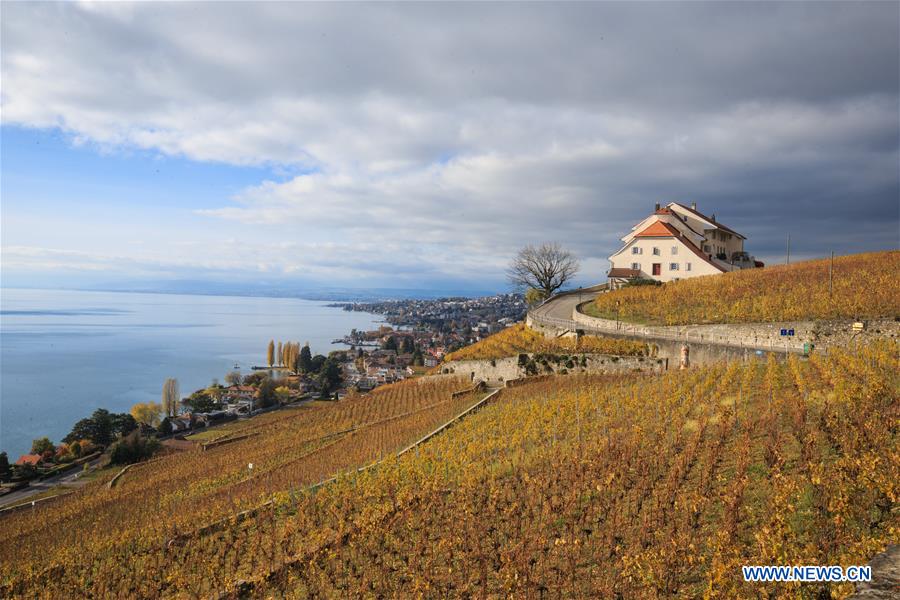 Photo taken on Nov. 12, 2016 shows the late autumn scene in vineyards in Lavaux, Switzerland. Lavaux Vineyard Terrace has been inscribed on the UNESCO's World Heritage List since June 28, 2007. (Xinhua/Xu Jinquan)