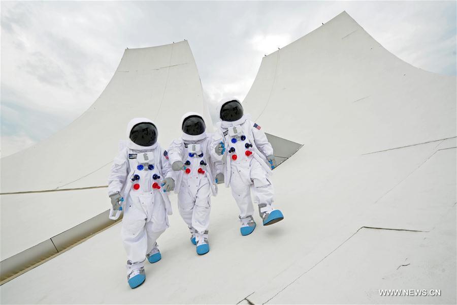 Astronaut mascots pose during a promotion event of the exhibition "NASA - A Human Adventure" at Singapore's ArtScience Museum, Nov. 16, 2016. The exhibition will be held from Nov. 19, 2016 to March 19, 2017, showcasing technology and engineering feats and achievements of the NASA. (Xinhua/Then Chih Wey)