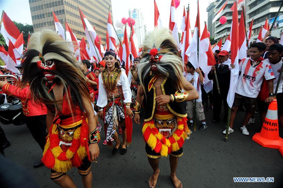 People wearing costumes from East Java march during a peaceful rally to promote tolerance and unity in Jakarta, Indonesia, Nov. 20, 2016. People took part in a rally against what they see as growing racial and religious intolerance in Indonesia, after police opened a blasphemy investigation into Jakarta governor Basuki Tjahaja Purnama. (Xinhua/Agung Kuncahya B.)