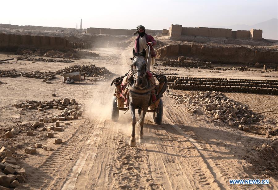 An Afghan man rides a horse to carry bricks at a brick factory in Kabul, capital of Afghanistan, Nov. 20, 2016. (Xinhua/Rahmat Alizadah)