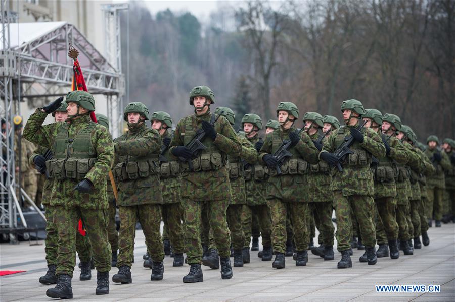 Members of Lithuanian armed forces attend the Lithuania's Armed Forces Day celebration in Vilnius, capital of Lithuania, on Nov. 23, 2016. Lithuanian armed forces and troops of some NATO member countries held a gala with formation on Wednesday to celebrate Lithuania's Armed Forces Day. The first decree on establishing armed forces was appoved on Nov. 23, 1918, which became the Armed Forces Day of the Baltic country. (Xinhua/Alfredas Pliadis)