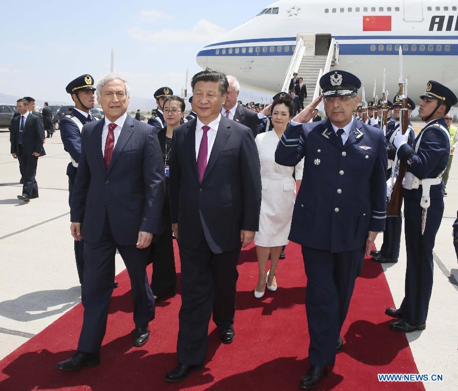 Chinese President Xi Jinping (C F) and his wife Peng Liyuan (3rd R) arrive in Santiago for a state visit to Chile Nov. 22, 2016. (Xinhua/Lan Hongguang)
