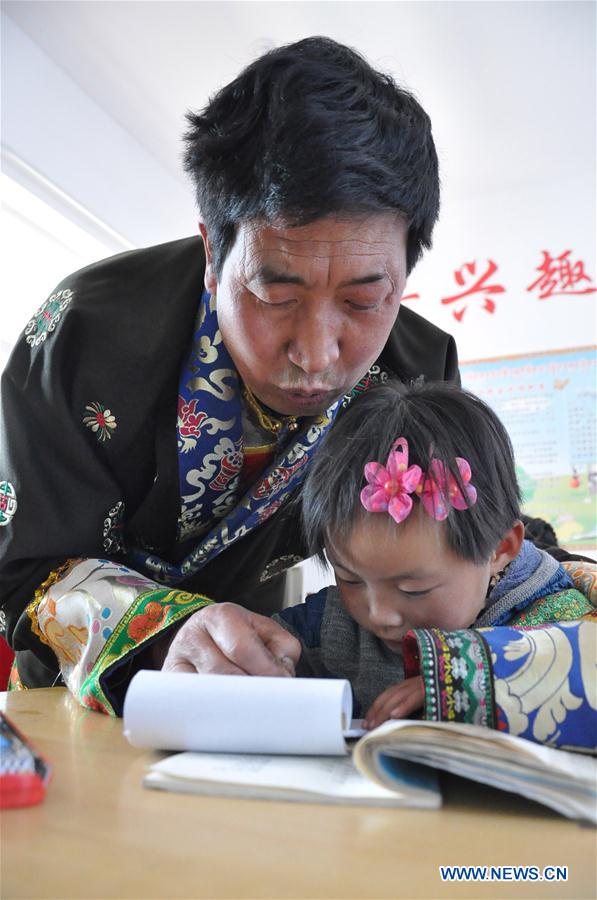 Teacher Zhangla Maodongzhi instructs a pupil at Daiqian school in Zhuaxixiulong Township of Tianzhu Tibetan Autonomous County, northwest China's Gansu Province, Nov. 24, 2016. To increase the enrollment rate of schools, especially ensure Tibetan children's access to education, about 62 schools of the county have concentrated the efforts in training teachers and attracting more competent faculties as well as improving conditions for teaching facilities. (Xinhua/Guo Gang)