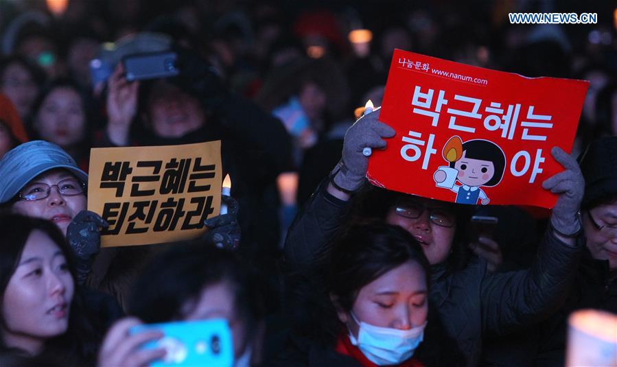 People attend a rally demanding President Park Geun-hye to step down in central Seoul, South Korea, Nov. 26, 2016. (Xinhua/Yao Qilin)