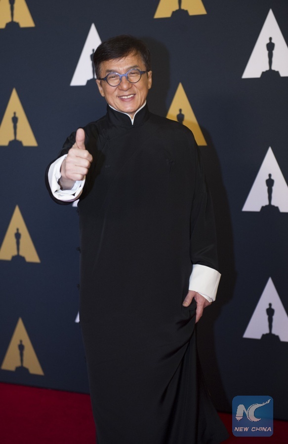 Jackie Chan poses with his thumbs up as he attends the eighth annual Governors Awards ceremony in Hollywood, California, the United States, on Nov. 12, 2016. Chinese actor Jackie Chan, British film editor Anne V. Coates, American casting director Lynn Stalmaster and American documentary filmmaker Frederick Wiseman were presented with the Academy's Honorary Awards Saturday night to recognize their lifetime contributions to the film industry. (Xinhua/Yang Lei)