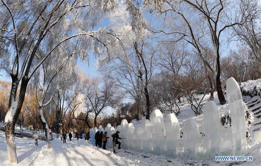 People work on an ice sculpture at Zhaolin park in Harbin, capital of northeast China's Heilongjiang Province, Dec. 16, 2016. The 43th Harbin ice lantern carnival will open on Dec. 20. (Xinhua/Wang Jianwei)