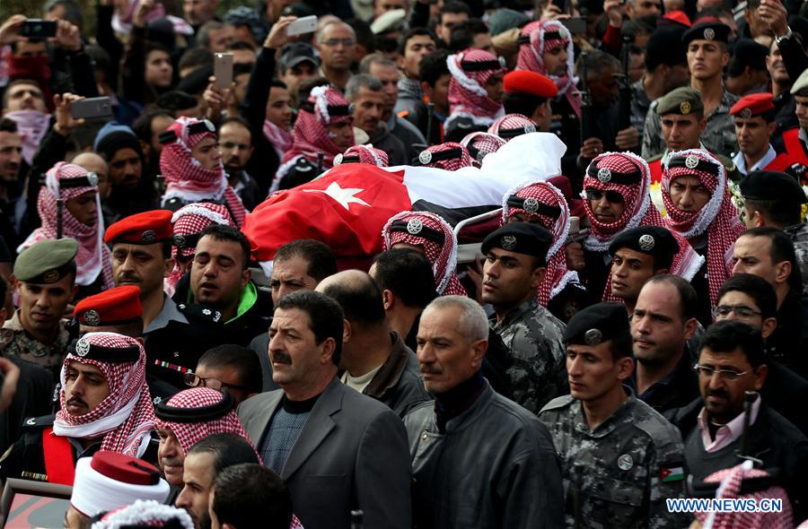Jordanians carry the body of police officer Mohammed Jizawi who was killed in clashes with gunmen during a funeral at Shajara Village near Ramtha, Jordan, on Dec. 21, 2016. Altogether four security forces members were killed on Dec. 20, 2016 in Jordan's southern Karak city in an exchange of fire with a group of gunmen, the state-run Petra news agency reported. (Xinhua/Mohammad Abu Ghosh)