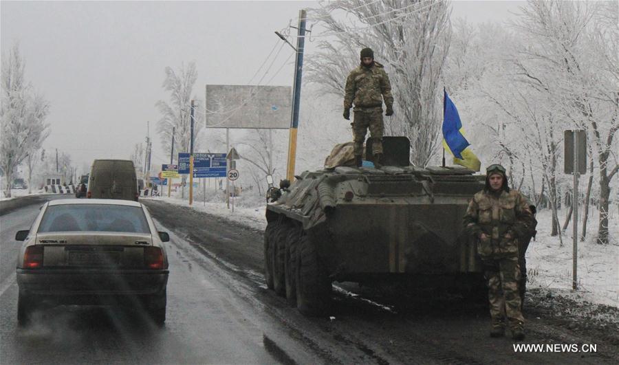 Photo taken on Dec. 24, 2016 shows a Ukrainian army's armored vehicle withdrawn from the frontline on the way to Donetsk city, Ukraine. The Ukrainian government reached a ceasefire with independence-seeking insurgents starting from Dec. 24 as was agreed by the Trilateral Contact Group on Ukraine crisis. (Xinhua/Chen Junfeng)