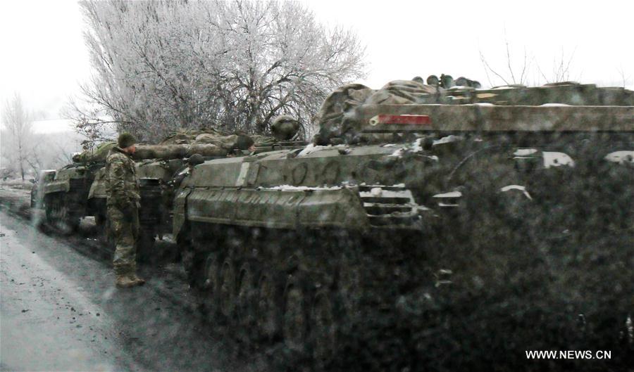 Photo taken on Dec. 24, 2016 shows Ukrainian army's armored vehicles withdrawn from the frontline on the way to Donetsk city, Ukraine. The Ukrainian government reached a ceasefire with independence-seeking insurgents starting from Dec. 24 as was agreed by the Trilateral Contact Group on Ukraine crisis. (Xinhua/Chen Junfeng)