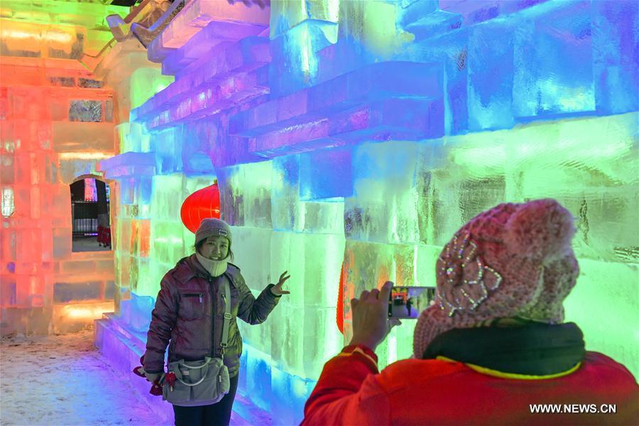 A woman poses for photos at the 43th ice-lantern festival in Harbin, capital of northeast China's Heilongjiang Province, Dec. 26, 2016. The ice-lantern show kicked off here Monday. (Xinhua/Wang Song)