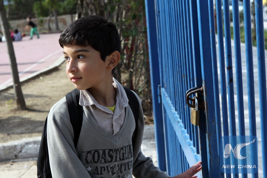 A young boy from Syria waits in the courtyard of the 2nd Tavros Elementary School to enter his classroom, in Athens, Greece on Oct. 19, 2016. (Xinhua/Marios Lolos)