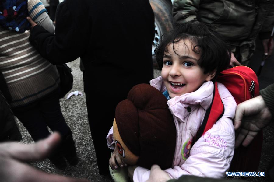 A girl evacuated from Idlib arrives at the Jibreen temporary shelter, south of Aleppo, Syria, on Dec. 19, 2016. Hundreds of people were evacuated on Monday from Kafraya and Foa, two Shiite towns besieged by the rebels in the northwestern province of Idlib, to Jibreen. (Xinhua/Ammar Safarjalani)