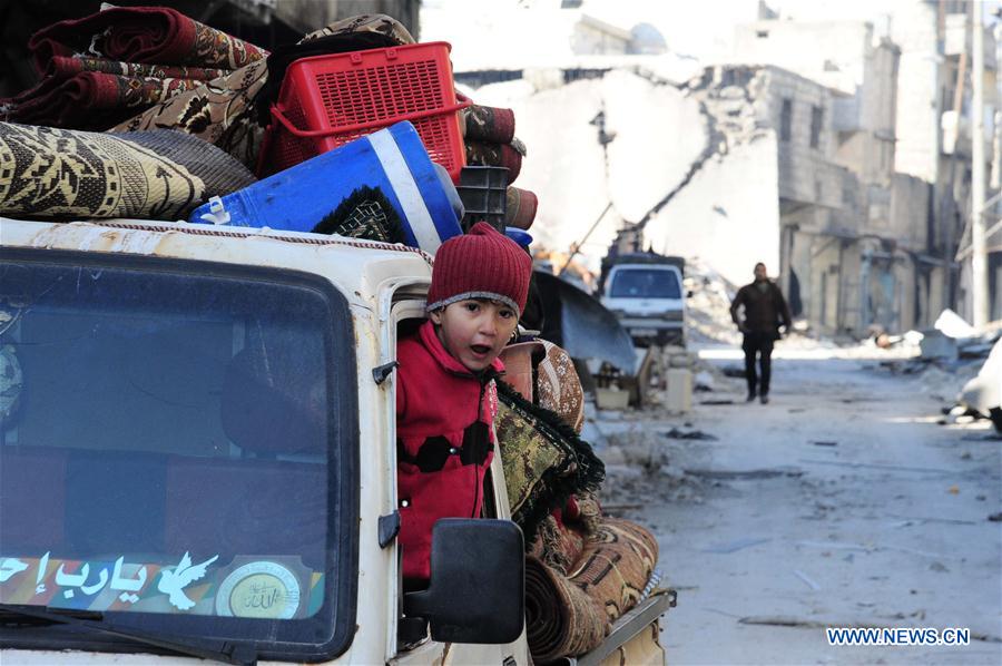 A Syrian girl looks out of her father's vehicle which carries belongings they have taken from their home at their war-shattered neighborhood of eastern Aleppo city, northern Syria, on Dec. 20, 2016. Civilians started returning to their original neighborhoods to check on their homes and belongings they had left behind when they fled eastern Aleppo almost four years ago. The Syrian army has recently dislodged the rebels out of that part of the city recently. (Xinhua/Ammar Safarjalani)