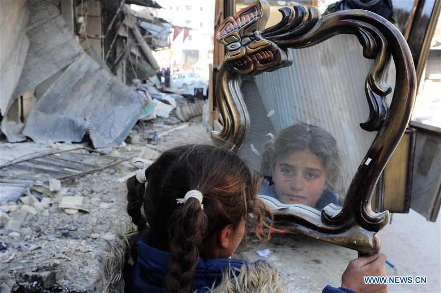 A Syrian girl looks in the mirror at her war-shattered neighborhood of eastern Aleppo city, northern Syria, on Dec. 20, 2016. Civilians started returning to their original neighborhoods to check on their homes and belongings they had left behind when they fled eastern Aleppo almost four years ago. The Syrian army has recently dislodged the rebels out of that part of the city recently. (Xinhua/Amma Safarjalani)