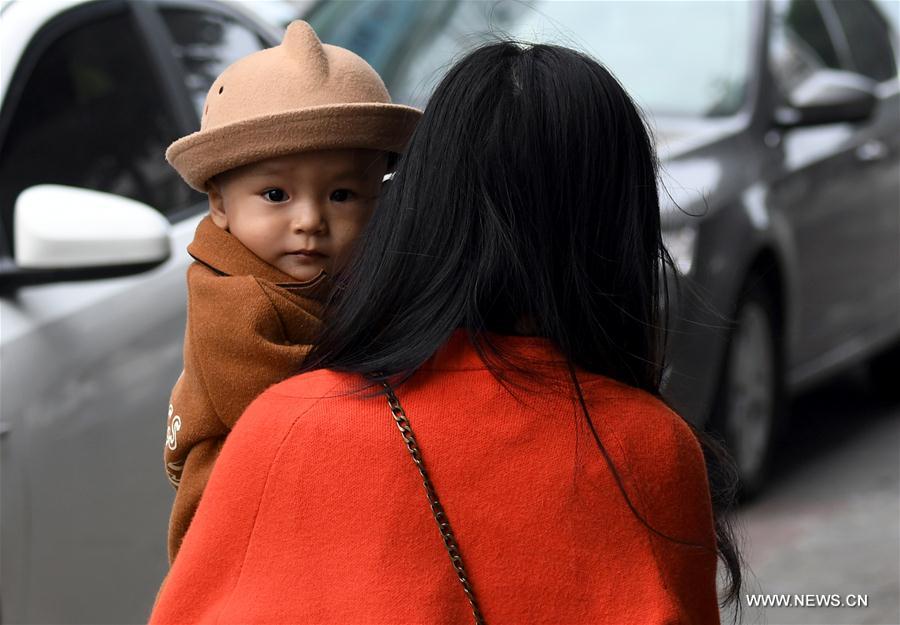 A woman holding a child walks in Haikou, south China's Hainan Province, Dec. 27, 2016. The island will experience a rapid temperature drop from Dec. 27 to 29. (Xinhua/Yang Guanyu)