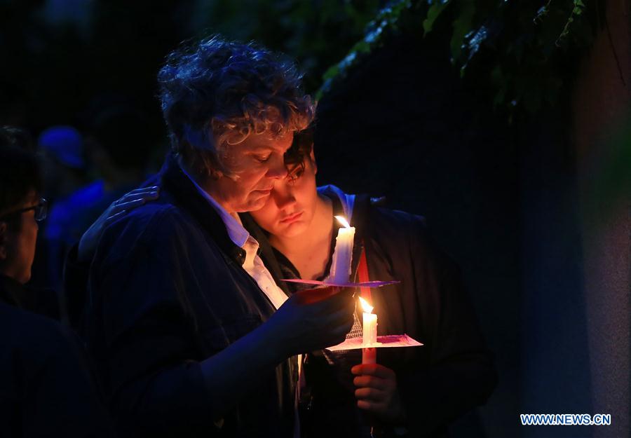 People hold candles to pay tribute to Orlando nightclub shooting victims in Toronto, Canada, June 12, 2016. (Xinhua/Zou Zheng)