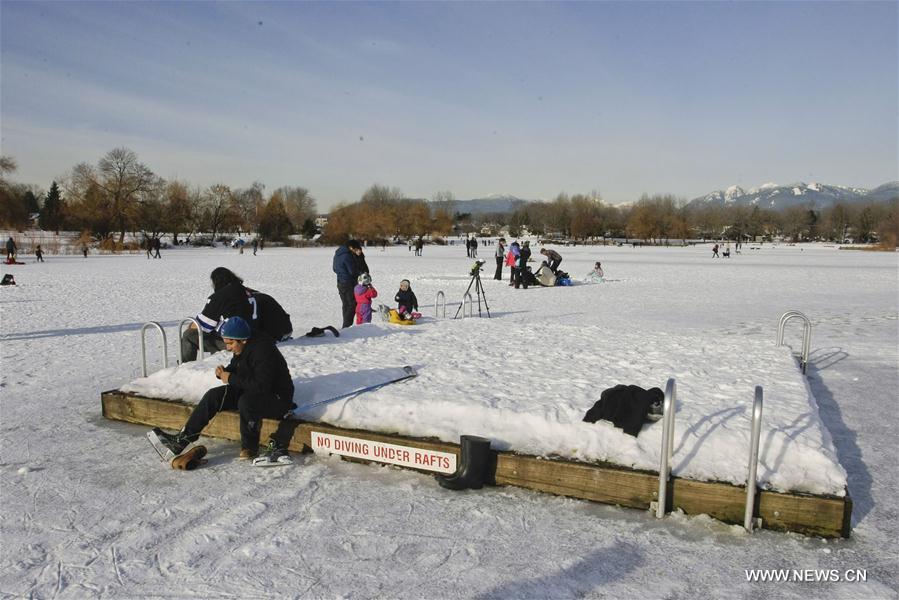 Residents take a rest on the raft in the middle of the frozen Trout Lake in Vancouver, Canada, Jan. 5, 2017. Prolonged cold temperatures have frozen the Trout Lake to a depth of 12 centimeters, the first time in 20 years. (Xinhua/Liang Sen)