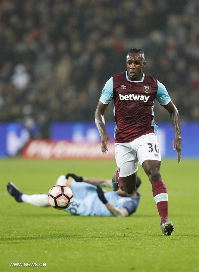 Michail Antonio of West Ham United (R) breaks through during the third round match of FA Cup between West Ham United and Manchester City at the London Stadium in London, Britain on Jan. 6, 2017. Manchester City won 5-0. (Xinhua/Han Yan)