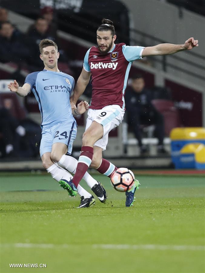 John Stones (L) of Manchester City vies with Andy Carroll of West Ham United during the third round match of FA Cup between West Ham United and Manchester City at the London Stadium in London, Britain on Jan. 6, 2017. Manchester City won 5-0. (Xinhua/Han Yan)