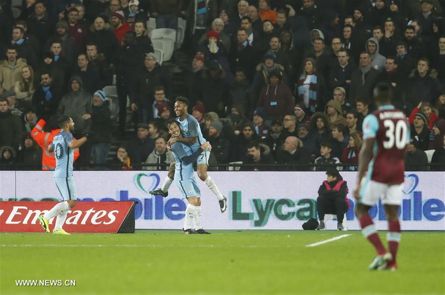 David Silva (2nd L) of Manchester City celebrates with Raheem Sterling (3rd L) after scoring during the third round match of FA Cup between West Ham United and Manchester City at the London Stadium in London, Britain on Jan. 6, 2017. Manchester City won 5-0. (Xinhua/Han Yan)