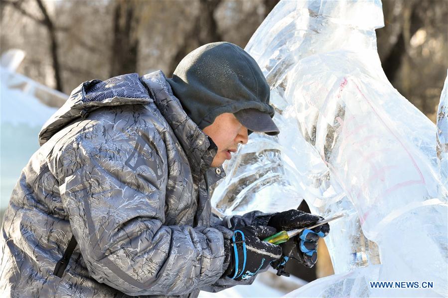 A participant carves an ice sculpture during a national ice sculpture contest in Harbin, capital of northeast China's Heilongjiang Province, Jan. 9, 2017. The contest, attracting 80 contestants nationwide, concluded on Monday.(Xinhua/Wang Song)