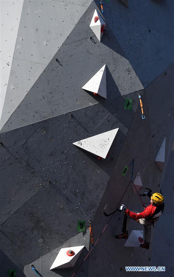 Russia's Kuzovlev Nikolai competes during the men lead final at the 2017 UIAA Ice Climbing World Cup in Beijing, capital of China, Jan. 9, 2017. Kuzovlev Nikolai claimed the title of the event. (Xinhua/Tao Xiyi)