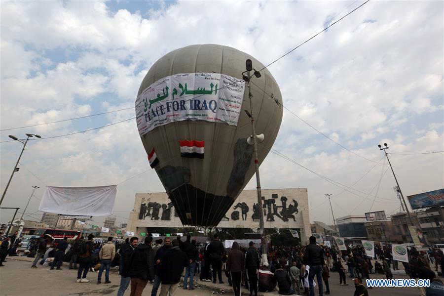 Iraqis prepare a hot air balloon with slogan "peace for Iraq" written in different languages before its take-off at Tahrir Square in downtown Baghdad, Iraq, Jan. 9, 2017. The event is to show support for government forces currently fighting against the Islamic State militants. (Xinhua/Khalil Dawood)