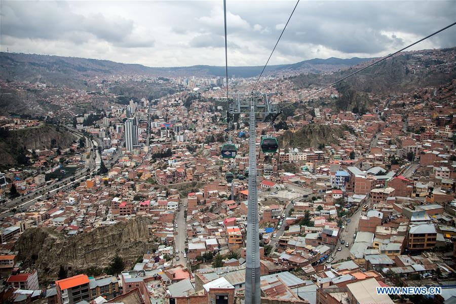 Photo taken on Jan. 8, 2017 shows the cable cars of green line commuting in La Paz, capital of Bolivia. The aerial cable transport system linking the cities of La Paz and El Alto emerges as an alternative to public transport, given the growing demand of people in two cities. (Xinhua/Li Ming)