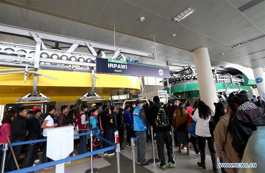 People queue for the cable cars at the Libertador station in La Paz, capital of Bolivia. on Jan. 7, 2017. The aerial cable transport system linking the cities of La Paz and El Alto emerges as an alternative to public transport, given the growing demand of people in two cities. (Xinhua/Li Ming)