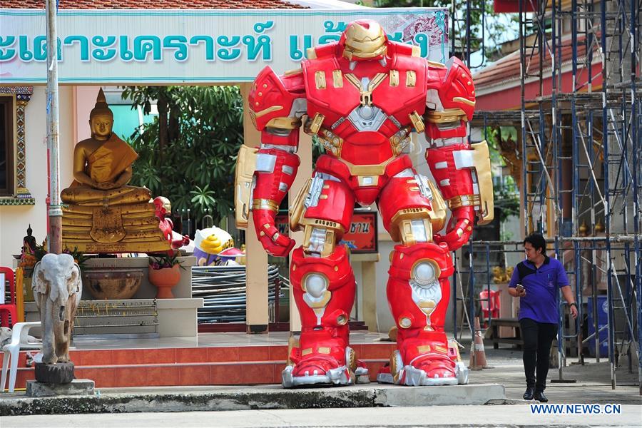 A man walks past an Iron Man statue at the Wat Tam Ru temple in central Thailand's Samut Prakan Province, Jan. 11, 2017. In order to encourage youngsters to visit Wat Tam Ru and learn Buddhist teachings, the abbot decided to change the temple's outlook by adding elements of modern pop culture. Eventually, the statues of a number of comic-book figures, including Iron Man, Hulk and Superman, have been introduced to this place of worship. (Xinhua/Rachen Sageamsak)