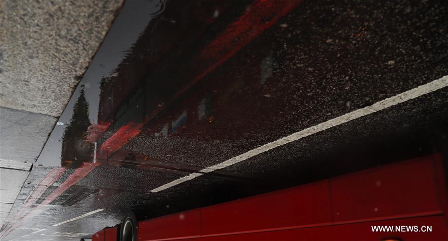 This reversed photo shows a touring bus passes by the "Big Ben" in snow in central London, Britain, on Jan. 13, 2017. (Xinhua/Han Yan)