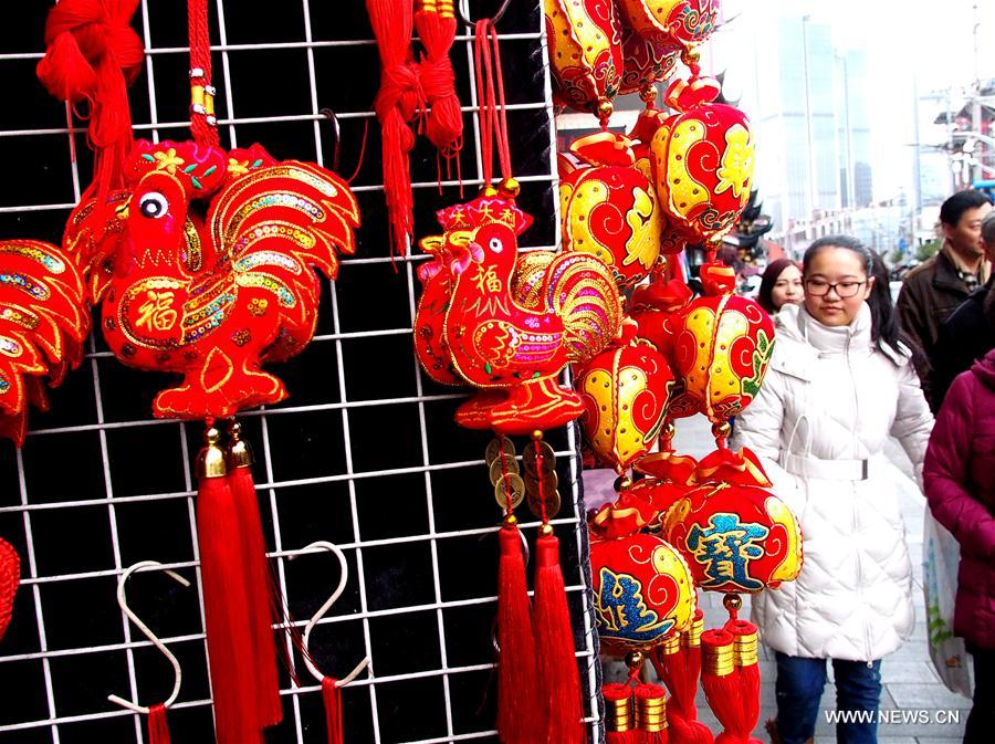 People walk by New Year decorations at the Chenghuangmiao market in Shanghai, east China, Jan. 15, 2017. Chinese traditional elements are seen on the streets in Shanghai to greet the upcoming Chinese Spring Festival, or lunar New Year of Rooster, which falls on Jan. 28 this year. (Xinhua/Chen Fei)