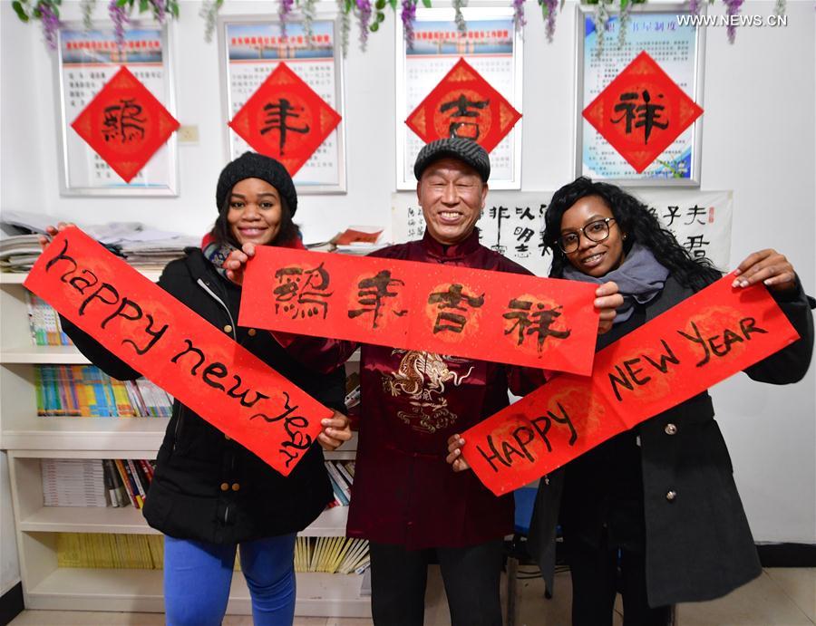 Foreign students and a local resident(C) present Spring Festival couplets at a local community in Nanchang, capital of east China's Jiangxi Province, Jan. 17, 2017. The activity was organized to bring warm greetings to the foreign students for the upcoming Spring Festival. (Xinhua/Hu Chenhuan)