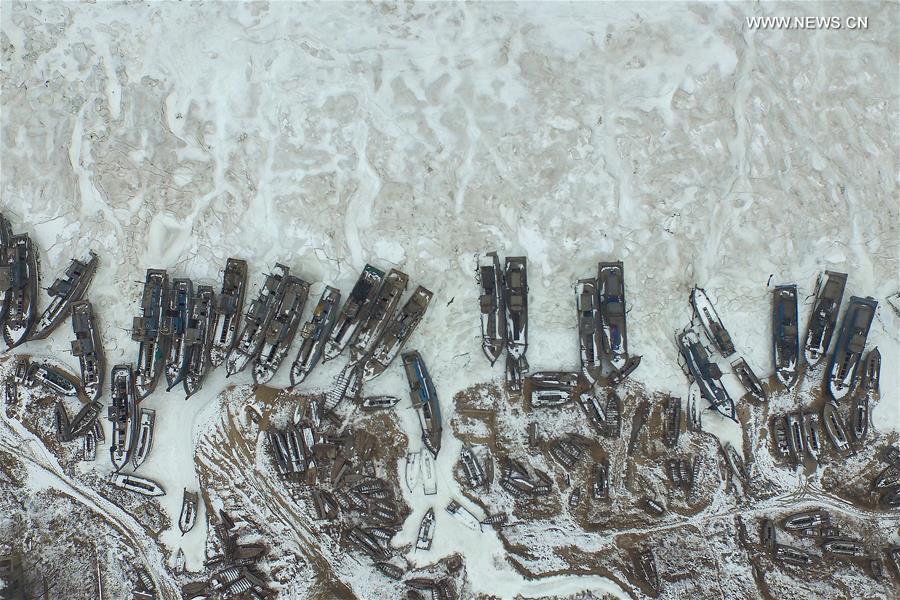 Fishing boats anchor along the coast in Wanghaizhai Village of Bayuquan District in Yingkou, northeast China's Liaoning Province, Jan. 17, 2017. According to North China Sea Marine Forecasting Center of State Oceanic Administration, sea ice area in Liaodong Bay in northeast China has risen to 6,098 square kilometers, 19.93 percent of the Liaodong Bay area. (Xinhua/Pan Yulong)