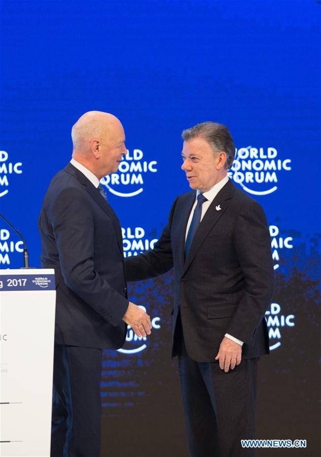 Colombian President Juan Manuel Santos (R) shakes hands with World Economic Forum (WEF) and Executive Chairman Klaus Schwab during the Global Statesman Award ceremony at the annual meeting of the WEF in Davos, Switzerland, on Jan. 18, 2017. (Xinhua/Xu Jinquan)