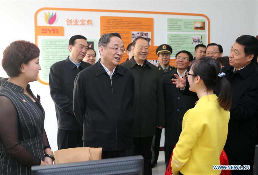 Yu Zhengsheng, member of the Standing Committee of the Political Bureau of the Communist Party of China (CPC) Central Committee and chairman of the National Committee of the Chinese People's Political Consultative Conference (CPPCC), talks to people at a farm in Toutunhe, northwest China's Xinjiang Uygur Autonomous Region, Jan. 17, 2017. Yu made an inspection tour in Xinjiang from Monday to Wednesday. (Xinhua/Liu Weibing)
