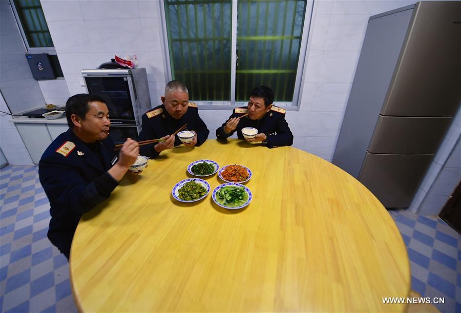 Railway staff member Sun Qiliang (R), Fang Zewen (C) and Hou Xinlong have dinner at Hetanbu Railway Station, east China's Jiangxi Province, Jan. 18, 2017. Hetanbu Railway Station is a minor station on Shanghai-Kunming Railway with only three staff members Sun Qiliang, Fang Zewen and Hou Xinlong who are in charge of equipment maintenance and emergency treatment there. Due to remoteness, the tiny station where the three veterans spend most of their time every year has become not only a working site but also a home for them. (Xinhua/Hu Chenhuan)