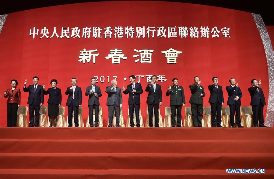 Honorable guests attend a Spring Festival gathering held by the Liaison Office of the Chinese Central People's Government in Hong Kong at the Convention and Exhibition Center in Hong Kong, south China, Jan. 19, 2017. (Xinhua/Wang Shen)