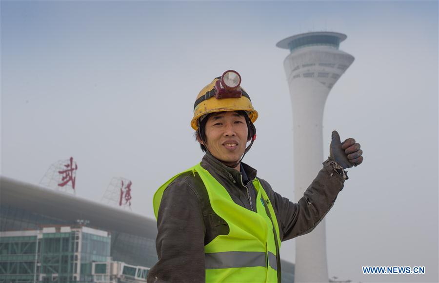 Zang Haizhou, a mechanical and electrical installation worker, poses for photos with the T3 terminal construction site at the Tianhe Airport in Wuhan, capital of central China's Hubei Province, Jan. 19, 2017. The terminal, with the mechanical and electrical installation mostly complete, will be put into use by next March. Workers of this project on Thursday posed for photos with the construction site before returning home for family reunion. (Xinhua/Ke Hao)