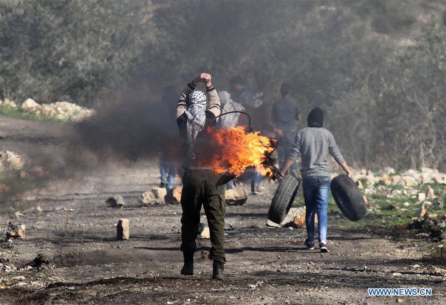A Palestinian protester burns a tire during clashes with Israeli soldiers after a protest against the expanding of Jewish settlements in Kufr Qadoom village near the West Bank city of Nablus, Jan. 20, 2017. (Xinhua/Nidal Eshtayeh)