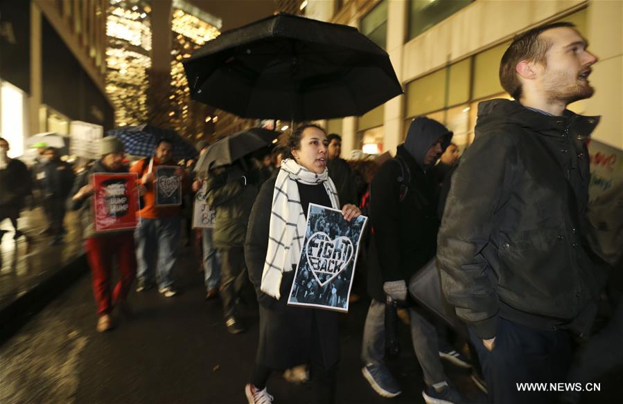 People take part in a demonstration to protest against Donald Trump's inauguration as U.S. president, in New York Jan. 20, 2017. (Xinhua/Wang Ying)