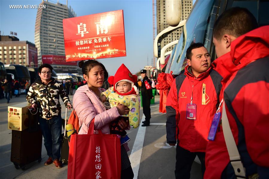 Migrant worker family queue for boarding a coach at Fuyang Railway Station in Fuyang, east China's Anhui Province, Jan. 21, 2017. Migrant workers can get free coach service back to hometowns at Fuyang Railway Station from Jan. 21 to 25. (Xinhua/Liu Junxi)