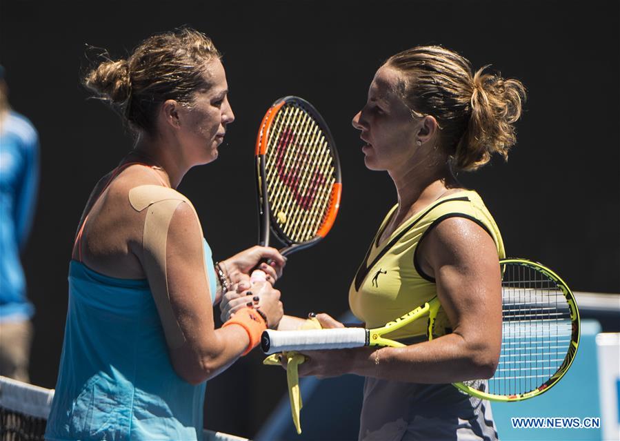 Anastasia Pavlyuchenkova (L) of Russia shakes hands with her compatriot Elina Svitolina after the women's singles third round match at the Australian Open Tennis Championships in Melbourne, Australia, Jan. 22, 2017. Anastasia Pavlyuchenkova won 2-0. (Xinhua/Lui Siu Wai)