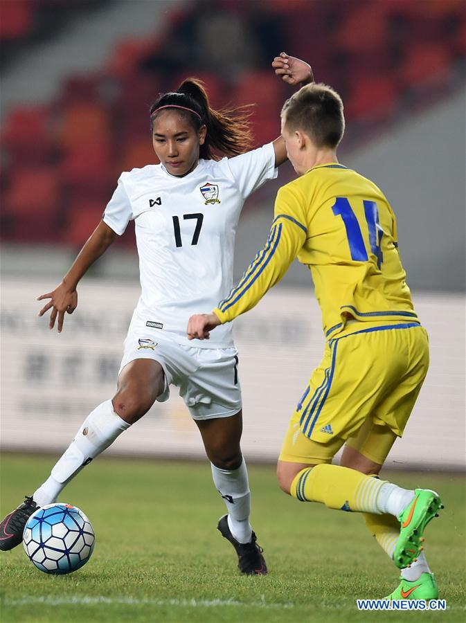 Thailand's Taneekarn Dangda (L) vies with Liubov Shmatko of Ukraine during their match at the Chunhui Logistics Cup CFA International Women's Football Tournament Foshan 2017 in Foshan, south China's Guangdong Province, Jan. 21, 2017. Thailand won 1-0. (Xinhua/Jia Yuchen)