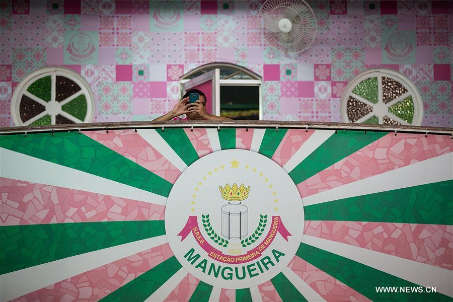 A man takes photos at the tribune before the "green and pink show essay" in Rio de Janeiro, Brazil, on Jan. 21, 2017. The show was a rehearsal for the upcoming Rio Carnival 2017. (Xinhua/Li Ming)