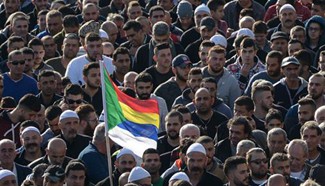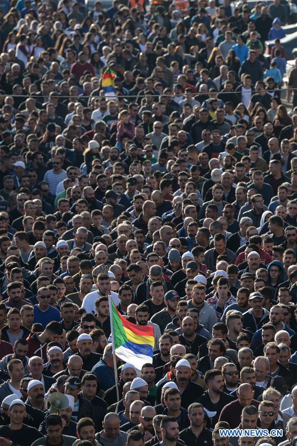 People take part in a protest against home demolitions in Arab neighborhoods in Maghar, Israel, on Jan. 24, 2017. An estimated 6,000 people gathered in the Arab majority town of Maghar on Tuesday. (Xinhua/JINI/Gil Eliyahu)